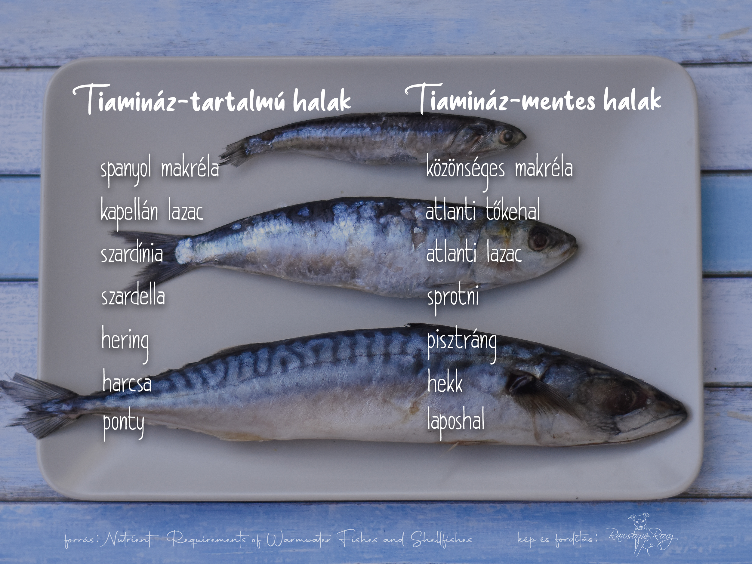 A higanytartalom mellett a másik rizikófaktor lehet a tiamináz. Bizonyos nyers halak tiamináz enzimet tartalmaznak, amely megköti és inaktívvá teszi a B1 vitamint - túl sok tiamináz révén könnyen hiányállapot lép fel B1 vitaminból. A B1 vitamin néven ismert tiamin egy vízben oldódó vitamin, amely elsősorban a szénhidrát-anyagcserében vesz részt, a szénhidrátok energiává történő alakításához szükséges. 1Ha az étrendben a szénhidrát az elsődleges energiaforrás, a B1 vitaminra is megnövekszik az igény. A tiamin nélkülözhetetlen továbbá az idegrendszer, az izmok és a szívizom egészséges működéséhez is. A B1 vitamin hiányának tünetei a kimerültség, memória- és idegrendszeri zavarok, hosszú távon pedig szívelégtelenséghez vezethet. 2Egy tanulmány is foglalkozott a tiamin és a tiamináz kérdéskörével. A vizsgálatban szereplő 12 szánhúzó kutya körülbelül fél éven át friss fagyasztott pontyokat és márnához hasonló halakat kapott enni, amelynek következtében súlyos tiaminhiány lépett fel. A boncolás során kiderült, hogy a tiamináz-tartalmú halakból álló egyoldalú étrend miatt kimerültek a tiamintartalékok, amely összefüggésben állt a neurológiai tünetekkel és végül az elhullással. Az esettanulmány egy tanulságos példa a tartósan egyoldalú táplálás káros hatásaira.